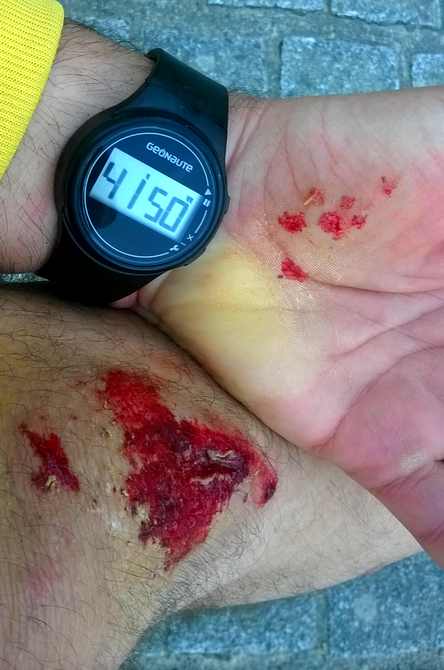 J’ai chuté à la fin du tour de l’étang à pleine vitesse.(minute 24) le sol du chemin est irrégulier; j’ai eu le sentiment de sauter un tremplin, j’ai d’abord atteri sur mes jambes mais à une vitesse trop important pour me mettre à courrir, mes molets était sur le point de cramper.