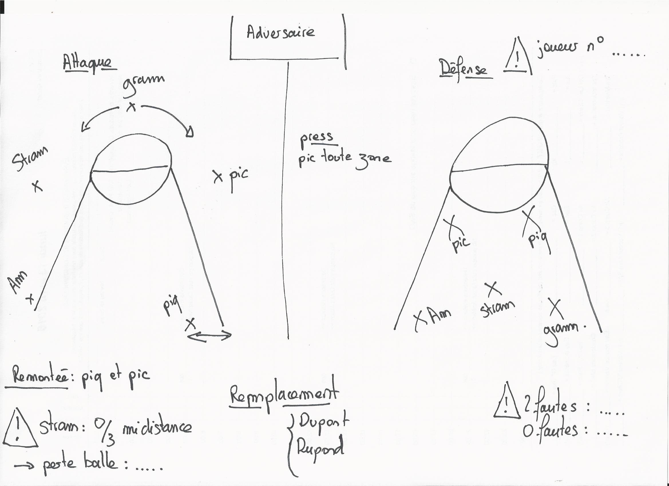 Quelle stratégie offensive ? quel schéma de jeu ? Qui fait quoi ? qui mène le jeu ? qui pars en contre attaque ? qui se place à gauche à gauche ? à droite ? ligne de fond ?