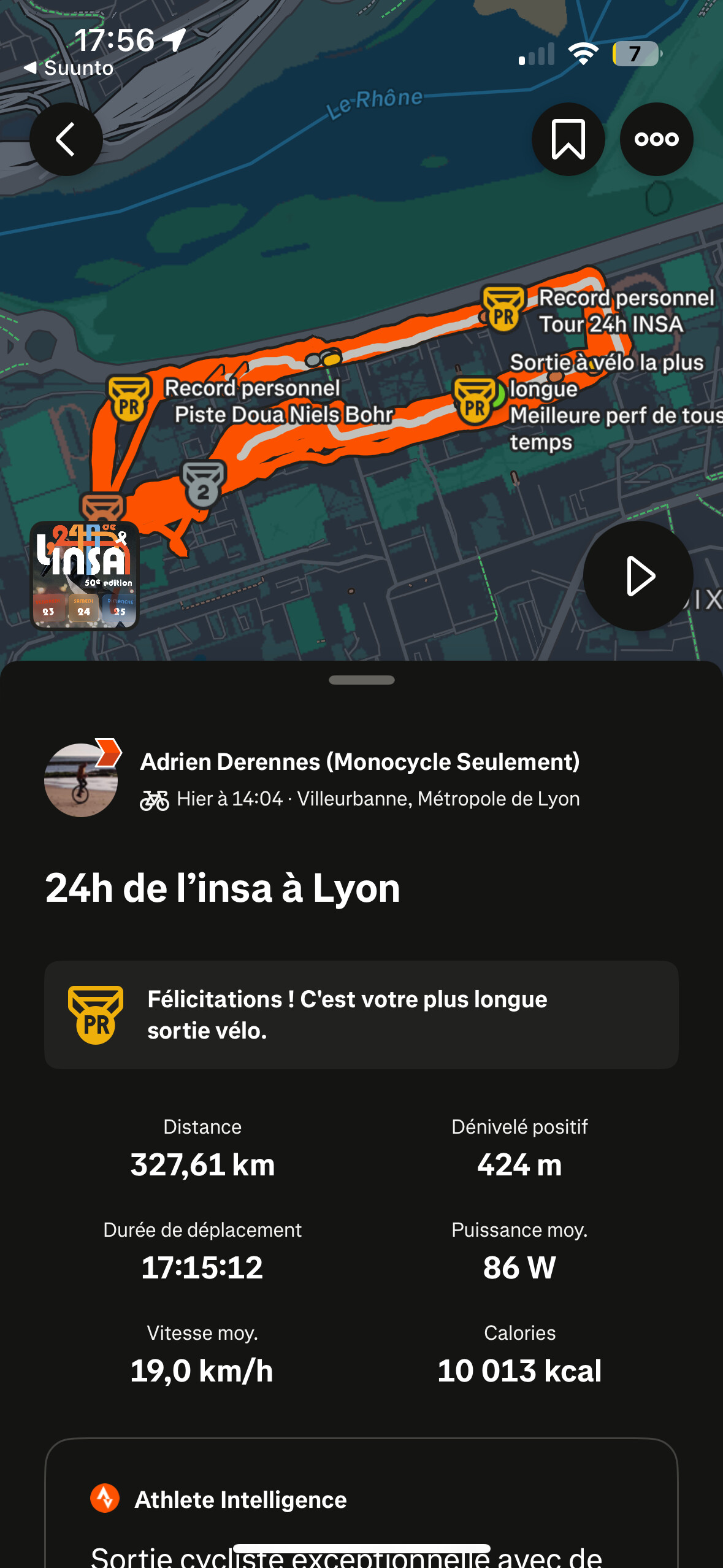 Cette aventure m’a fait pédaler plus de 17h, soit 45 minutes de plus que l’an passé, j’ai parcouru plus de 20km de plus que l’an passé. Mais avant tout j’ai passé un super moment, souvent sur le circuit à tourner en compagnie de cyclistes qui restaient à ma hauteur pour me parler parfois sur plusieurs tours, merci à eux, Franck et Zadig plus particulièrement.