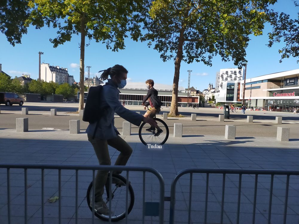 2 rangées de barrières qui n’ont jamais été vides, 1 monocycliste étudiant nouvellement arrivant sur Rennes, beaucoup d’essais intéressants, 1 seule chute impressionnante pour la testeuse, 8 mails récupérés, des flyers distribués et beaucoup d’intérêt pour samedi prochain, Marie en représentation, Tudan et Marie en vadrouille autour de la place, le biclown utilisé avec plus ou moins de succès